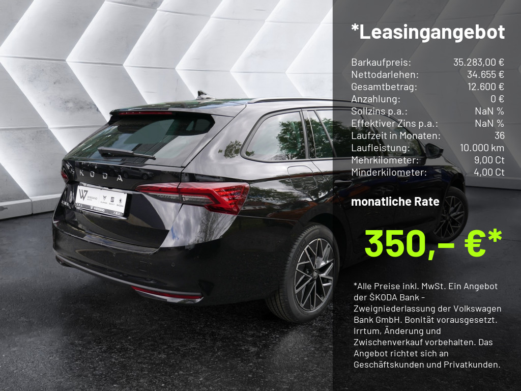 *Ein unverbindliches Leasingangebot der ŠKODA Bank - Zweigniederlassung der Volkswagen Bank GmbH, Gifhorner Straße 57, 38112 Braunschweig. Das Angebot richtet sich an Privatkunden und Geschäftskunden. Alle Preise inkl. 19% Mehrwertsteuer. Fahrzeugpreis: 35.283,00 EUR, Nettodarlehensbetrag: 34.654,75 EUR, Einmalige Leasingsonderzahlung: 0,00 EUR, Laufzeit: 36 Monate, Laufleistung p.a.: 10.000 km, monatliche Leasingrate: 350,00 EUR, Gesamtbetrag: 12.600,00 EUR (Summe aus Leasingsonderzahlung und monatlichen Leasingraten), Minderkilometer: 4,17 Cent/km, Mehrkilometer: 9,16 Cent/km, Freigrenze: 2.500 km.